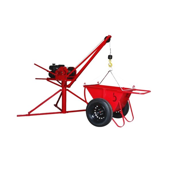 Se utiliza en la construcción de edificios para elevar materiales a la azotea o a pisos altos. Funciona con motor a gasolina. Incluye el malacate, pluma con giro, cable de acero, vogue y polea de arrastre.
